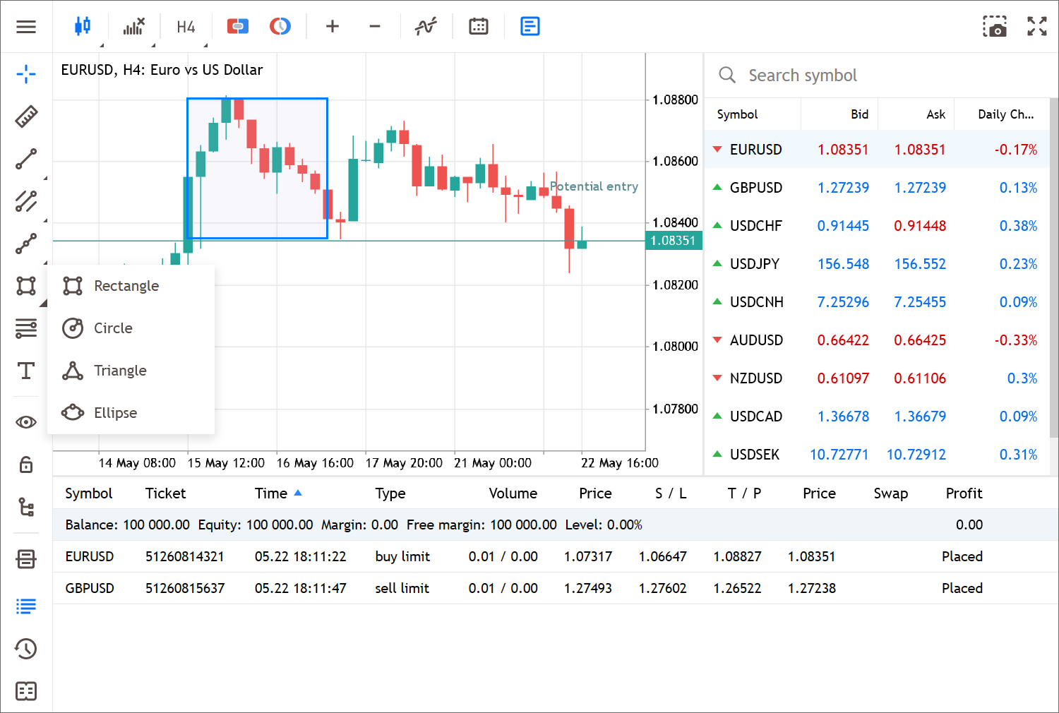 - 扩展可用分析对象的列表。现在,您可以利用标尺来测量时间和价格,绘制图形(矩形、椭圆形、三角形和圆形),并向图表添加标签。所有对象都可以在左侧面板中找到: